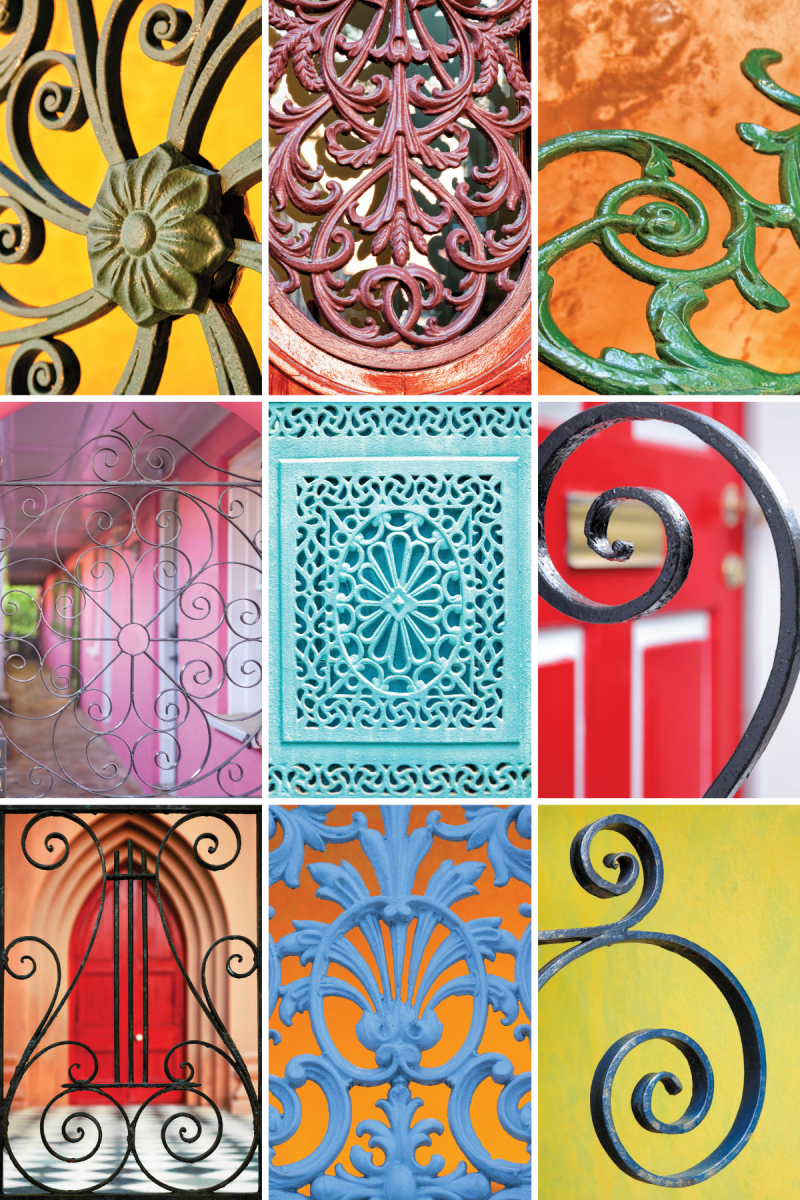 (From the top, left to right) Market Hall motif, building constructed circa 1840 (September 2011); Brasserie La Banque door detail, 1 Broad Street, building constructed circa 1853 (March 2018); Gaillard-Bennett House entry gate detail, 60 Montagu Street, building constructed circa 1800 (September 2011); piazza entry gate, 78 Beaufain Street (April 2022); Ansonborough grille (April 2019); James Ladson House handrail detail, 31 Meeting Street, building constructed circa 1792 (March 2013); St. Matthew’s Lutheran Church gate detail, 405 King Street, building constructed circa 1867 (February 2011); Wells Fargo window grille detail, 16 Broad Street (June 2018); French Quarter carriage house gate detail (December 2014)