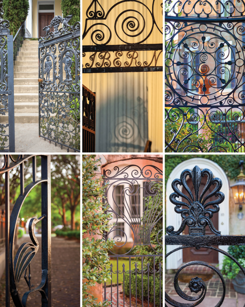 (From the top, left to right) Cast-iron entry gate, 34 Montagu Street (May 2018); Hibernian Hall entry gate detail, 105 Meeting Street, building constructed circa 1839, gate crafted by Christopher Werner (July 2019); Simmons-Edwards House fence detail, 14 Legare Street, building constructed circa 1800, with decorative wrought-iron panels installed after 1816 (August 2019); Egret Gate at Joe Riley Waterfront Park, designed by Philip Simmons and crafted by his apprentices (April 2017); George Williams Coach House garden gate, 19 Church Street, building constructed circa 1975, garden designed by Loutrel Briggs in 1940 (November 2015); entry gate detail, 10 Legare Street (February 2019)