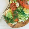 A grilled salmon salad nods to his and Anne’s time in South Africa. “In Cape Town, if we wanted to eat pescatarian, we had to learn to cook for ourselves—so we began grilling local fish.” He perfected the art stateside while working under S.N.O.B. chef Frank Lee, who taught Emerson to grill salmon skin-side up so that the delicate flesh retains moisture. The pink fillets are served atop butter lettuce, dill, cucumber, and radish slices drizzled in homemade lemon-garlic vinaigrette.