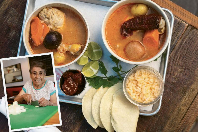 One of Abuela’s cherished family recipes is caldo Tlalpeño (above), a spicy chicken and chipotle soup from Tlalpan—a borough of Mexico City; (inset) “Abuela says in life, you must be strong and brave,” shares Sandra. “Fuerte y valiente.”