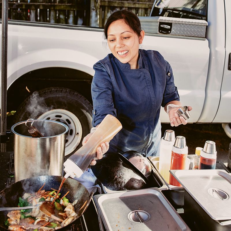 TS: The heat can get pretty bad in a truck, and I dislike the idea of being enclosed in a beautiful city like Charleston. Also, when I cook, I like people to be able to watch me. Customers will usually stand there and see me with the wok and notice our set-up, which just makes the whole process feel more real to me. It’s so much fun to interact, so I always try to face the customers when I’m cooking.