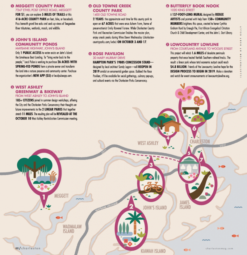 With major projects underway involving public green spaces—from the West Ashley Greenway and Bikeway to the peninsula’s Lowcountry Lowline to The Local Pulse’s idyllic effort on John’s Island—we thought it was time to catch up on all the action. Here, find outdoor spots you can visit now, and get an update on those still in progress (hint: a few need your support)