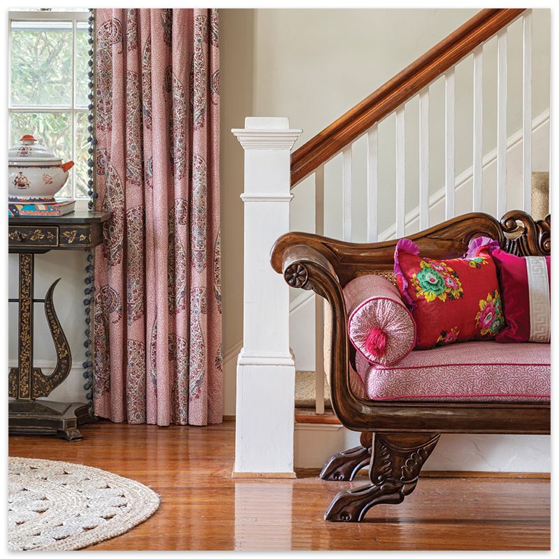 Vintage and contemporary equestrian art, an antique writing desk from her family’s farm, and two hot pink club chairs opposite a gorgeous green sofa upholstered in Sabina Fay Braxton fabric combine to produce a space that’s simultaneously vibrant and relaxing. Ralph’s layering of color, pattern, and texture adds interest, while soft undertones and inviting furniture invoke feelings of calm.