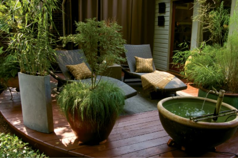 Adding to the impression that you’ve stepped into a tropical paradise are an elaborate arbor and two decks, all dressed to look like “little rooms of their own”—complete with comfortable seating, weather-resistant rugs (“for a more modern look”), bubbling fountains, and containers full of plantings that range from Amelia’s adored ‘Butterfly’ Japanese maple to succulents and small water gardens. “I love water plants. Fill a container with a really muddy dirt that holds moisture well, and they require little care but provide a lot of visual interest,” advises Amelia.
