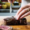 For tonight’s presentation, a special date-night dinner celebrating the turning season, the couple veers from their plant-based norm: the star of the meal is bison strip steak, a cut for which Reitz gained an affinity while working in a Kentucky restaurant owned by bison farmers. “The steaks feel healthier to me than regular beef versions because they’re grass-fed and not quite as fatty,” he notes. Reitz tops the meat with roasted onions and a green sauce comprised of garlic, capers, and anchovies mixed with fresh herbs.