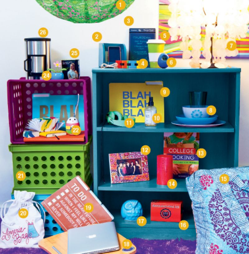 1. Lilly Pulitzer paper lantern in “Desert Tort,” $11 at Out of Hand 2. Wooden electronics charging station, $10 at World Market 3. Boogie Board paperless doodling pad, $35 at Brookstone 4. Five-port USB hub chain, $25 at Out of Hand 5. Ceramic coffee cup with silicone lid, $8 at World Market 6. “Bob” 5-in-1 Wobble Clock, $10 at Brookstone 7. Shell pendant lantern with base, $150 at World Market 8. Room Essentials tumbler, bowl, saucer, and dinner plate, $2 each at Target 9. “Blah” folders, $1.50 for set of three at Silver Puffin 10. The Laundress all-natural fabric spray, $14.50 at Stella Nova 11. WeSC Oboe headphones, $60 at Urban Outfitters 12. Room Essentials plastic frame, $5 at Target 13. College Cooking by Megan and Jill Carle, $20 at Carolina Girls 14. Flameless LED candle with floral cutouts, $13 at Target 15. Xhilaration twin bed set with reversible comforter, sham, sheets, and bed skirt, $60 at Target 16. Mr. & Mrs. 12-item Dorm Survival Kit, $27 at Out of Hand 17. Ceramic owl coin bank, $8 at Urban Outfitters 18. e-Pad portable bamboo laptop desk with suede cushion, $40 at Brookstone 19. Knock Knock “To Do” file folders, $10 for set of six at Out of Hand 20. Buckhead Betties canvas lingerie bag, $16 at Francesca’s Collections 21. Plastic stackable storage crates, $4 each at Target 22. VIO Light ZapiPOP-Za-Za Zapi toothbrush sanitizer with toothbrush, $35 at Out of Hand 23. Morph Pads notepaper, $18 at Silver Puffin 24. Two’s Company solar-powered “Bee Happy” dancing flower, $12 at Urban Outfitters 25. Blue Q’s “Shoe Addict” coin bank, $9 at Francesca’s Collections 26. Stainless steel single-cup coffee maker, $40 at Brookstone