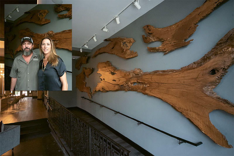 Perrin Woodworrking owners, Dan and Katy Perrin (inset), created a one-of-a-kind installaton for the lobby of The Guild apartment building downtown.