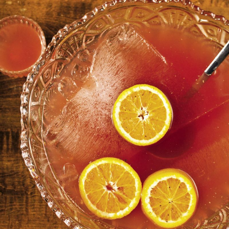 ❶ In a large punch bowl, combine 12 ounces rye whiskey, four ounces grenadine, four ounces mint green tea, four ounces lemon juice, six dashes Angostura bitters, and two ounces orange oleo-saccharum (a mix of citrus oil and sugar).