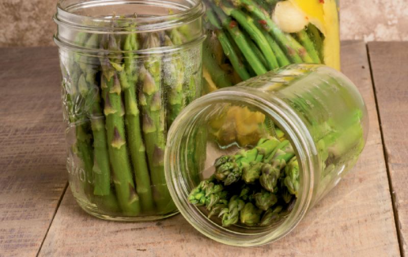 Peel six large garlic cloves and place one at the bottom of each jar. Tightly pack in the asparagus with the blunt ends facing down.