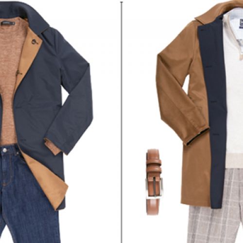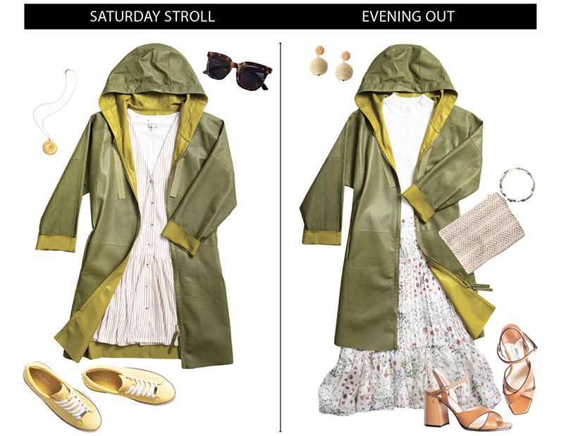 (LEATHER JACKET) Henry Beguelin reversible lightweight leather trench in “salvia“ and “curry,“ price upon request at RTW