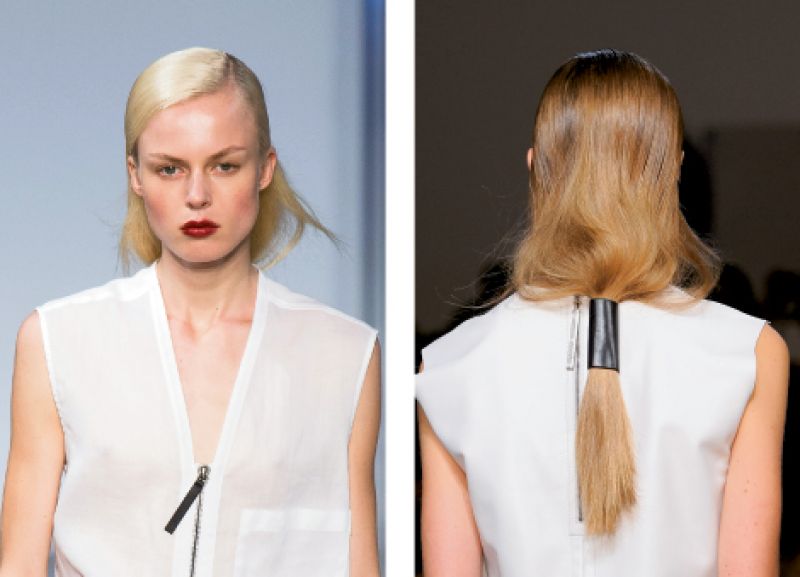 “In general, this season is all about imperfection. Loose, low, wavy, and natural ponytails are in. Keep waves youthful and wispy. Rub some gloss through your hair and part it off center for an off-duty vibe.”