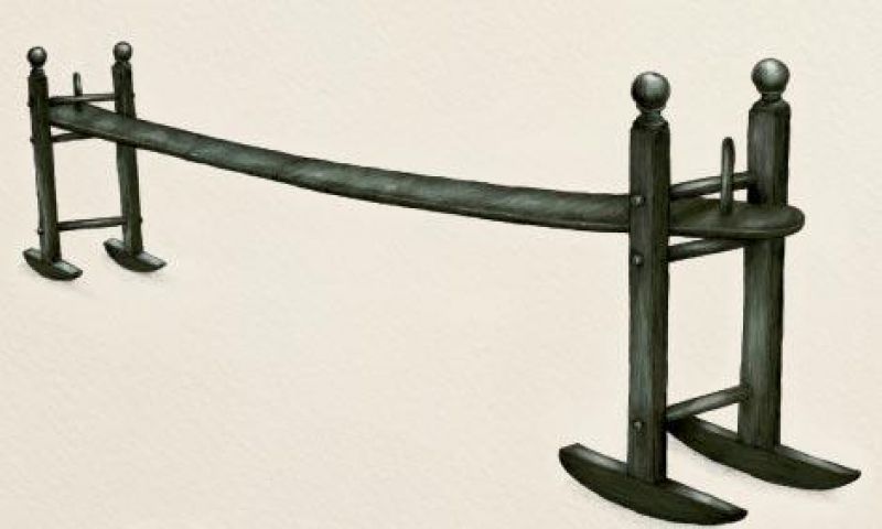The 16- to 22-foot long, 13-inch-wide board was customarily made of longleaf pine, though short supply of that material has resulted in yellow pine being used for today’s versions. Both woods are durable and strong, with enough give that boards will bend without breaking. Rockers are often added to the bottom of the stands so that you not only bounce, but rock back and forth, too.