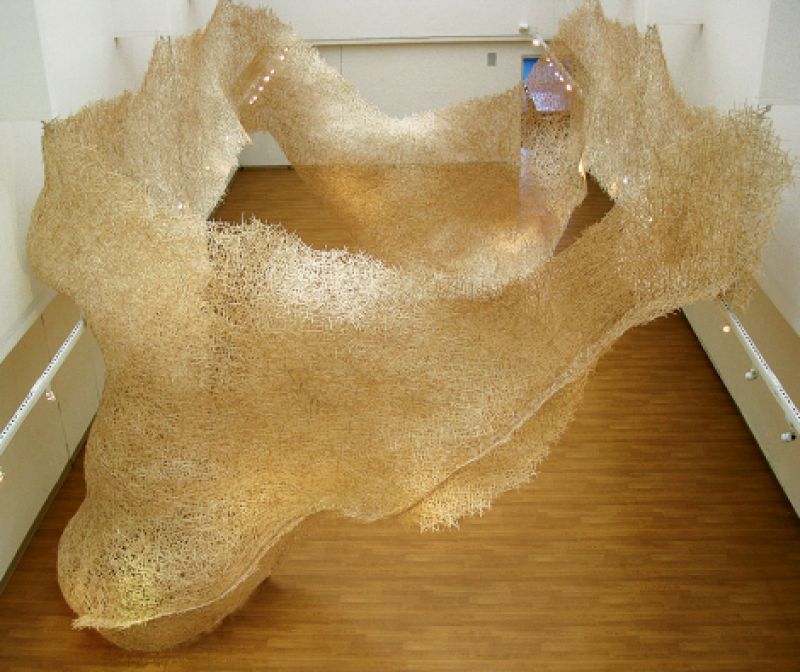 Brilliant designs his stir-stick sculptures to fit each space and incorporates gallery structures—like a staircase or chandelier—into the woven work. “I think of them as drawings in space, collapsed objects, distorted baskets that have been fed through some sort of digital filter, crumpled architecture,” he says. Each piece, made up of 50,000 to 60,000 sticks, takes about seven days to build on-site, and visitors can watch. “I turn the gallery into a studio,” he says. “You’re seeing the direct gesture. The materials are unaltered except for the insertion of my labor. I like the sculptures to settle and change shape. If they fall, that’s OK; it’s part of the process. If they fall after I leave, all the better. I can come back and do it again.”