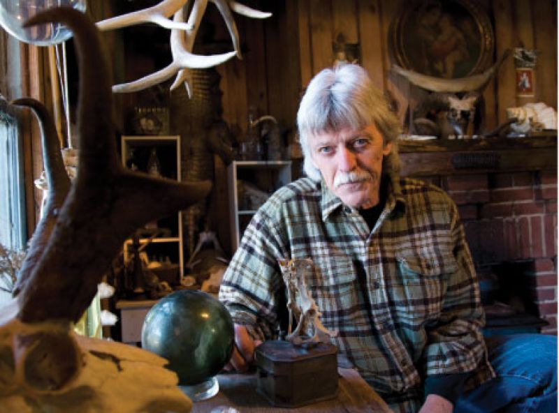 In the living room are a fiddle, a mandolin, and a pull-down classroom map of Africa; fossils, masks, a stuffed otter, and elk horns; Chinese shoes and vintage, red enamel Soviet star pins; an alligator hide; the artist’s print of Albert Einstein; a noose; mounted butterflies; a Buddhist mala; and a Victorian tea caddy. His drawing studio is papered in photographs, and there are stretched rattlesnake skins in the bedroom. “It’s an overwhelming amount of stuff,” he admits, joking that his fine arts training may be all that separates him from “that nut case with a yard full of whirligigs by the side of the road.”