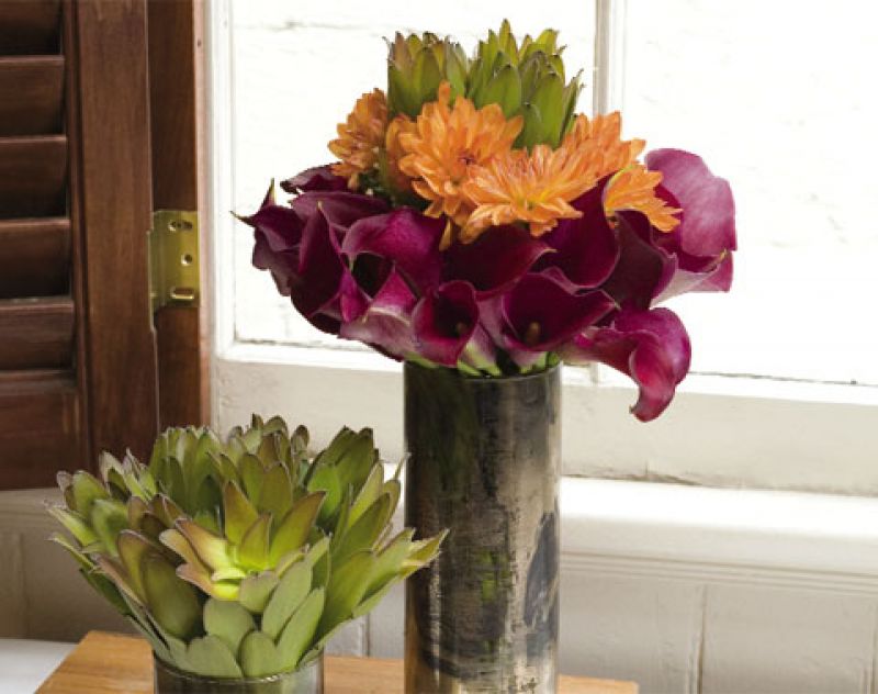 click here to download the instructions (adobe pdf) Materials ‘Safari Goldstrike’ leucadendron, orange dahlias, ‘Black Beauty’ calla lilies, scissors, and two containers of different heights (we used antiqued glass vases) Step 1: To create the first layer of calla lilies, trim stems so that the base of the bloom is an inch or less from the top of the vase. Step 2: Position lilies around the rim of the vase. Gently press them down so that they curve over the rim. Repeat with a second row of lilies, cut so that they are slightly taller than the first row. Step 3: Use dahlias to create your second tier of flowers, cutting stems so that blooms stand just above the lilies. Line the flowers around the inside of the circle of lilies. Step 4: Strip the bottom leaves off of the leucadendron so that they don’t crowd the vase and dirty the water. Step 5: Cut stems of leucadendron so that they are tall enough to rise a few inches above the dahlias. Fill a couple stems into the remaining space at the vase’s center.Use what’s left to create a monochromatic display: To complement your first arrangement, use extra flowers (of only one variety) to fill a second, smaller vase. Cut stems so that they create a full arrangement just over the top of the vase.