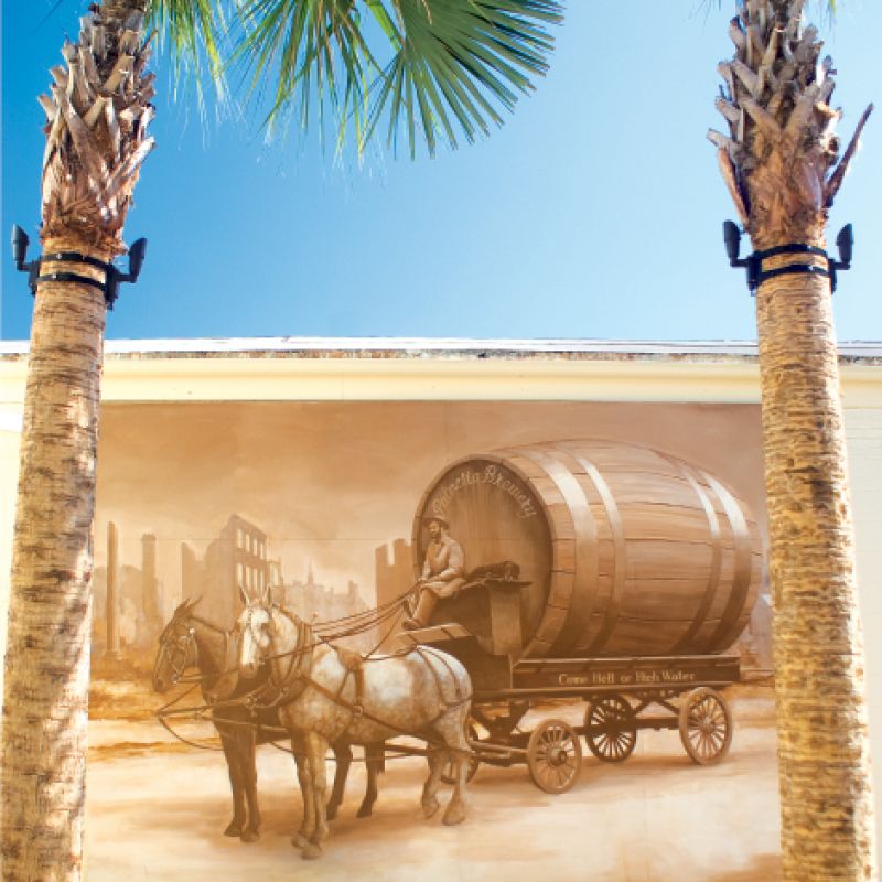 Today, more than 20 of his murals grace restaurants and other spaces throughout the Lowcountry. This month, he unveils fresh work at the new Mira Winery office on Queen Street. The mural pays homage to Renoir’s Luncheon of the Boating Party—but recasts the fêting friends as local restaurant titans such as Mike Lata and Sean Brock. And at the newly renovated Palmetto Brewery on Huger Street, one of his latest installations is turning heads with five panels depicting the pre-Prohibition beer biz. “It’s a fantasy of the original brewery,” Boatwright says. “Note surreal touches, like a giant beer bottle from the future.”