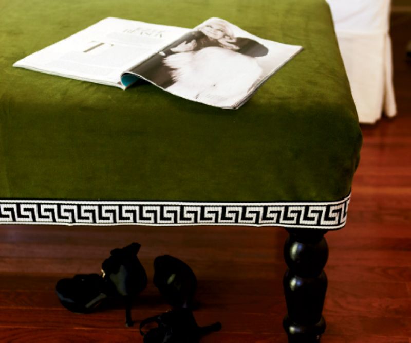 Good upholstered furniture doesn’t come cheap, but creative workarounds can yield big-time savings. Take this plain-Jane coffee table we found on Craigslist for $30: inspired by retail versions of luxe ottomans that pull double duty as extra seating, we dressed it up with regal green velvet ($18/yd.) and a Greek key-pattern trim ($6.99/yd.) for a DIY knockout.