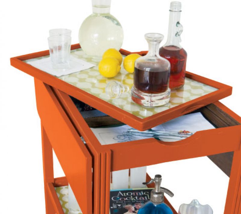 Step 1: A Cart of a Different Color After sanding down a few nicks and scars, we applied oil-based primer followed by a couple coats of orange paint in a satin finish. Step 2: Fine Print We covered both the table surface and lower shelf in a pretty fabric found in our scraps pile. Step 3: Raise Your Glass Settling on a primary use as a portable bar, we had a local hardware store cut two panes of glass to fit both the bottom shelf and top tray. This also allows for a quick change of the accent fabric. Step 4: Stash Your Supplies We stored cocktail napkins, swizzle sticks, bar recipes, and more in the felt compartment underneath the tray, formerly used for game accessories.