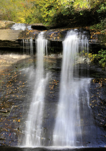 The Cashiers Area Chamber of Commerce, with a stock of maps and pamphlets describing local beauty spots, made it easy to drive from waterfall to waterfall. I plotted a course that zigged and zagged to the north and south as well as east and west of town. I found the best place to get the lay of the land is Whiteside Mountain, just five miles west of Cashiers. This massive outcropping of granitic gneiss rock rises majestically from the upland forest to an elevation of 4,930 feet and provides not only spectacular views into neighboring states but also an ecosystem capable of supporting endangered peregrine falcons and dozens of colorful wildflower species.