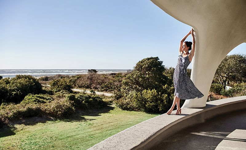 A STEP AHEAD - Milly “Kendall” asymmetrical dress in Italian cady, $495 at milly.com; Manolo Blahnik “Chaflahi” raffia sandal, price upon request at RTW; Christina Jervey 14K gold-plate “Mismatched Stick” earrings, $150 at Gwynn’s of Mount Pleasant
