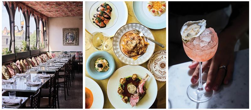 (Left to right) The new open-air veranda; A tableful of dishes, including (clockwise) hamachi crudo, scallop crudo, pappardelle in a braised oxtail ragu, Mediterranean lamb with crispy artichokes and tapenade, and shrimp pasta with caviar and the roasted pineapple with anise ice cream and candied pistachios & the Amuse Me cocktail with an oyster poised atop a Nick and Nora glass.