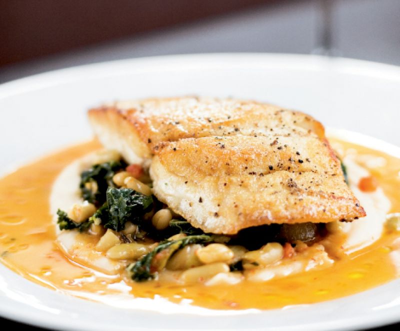 Main courses brought similar intrigue, with seven or eight entrées including fish, seafood, and meats procured from local providers and as many organic sources as possible. Our selections were excellent, including day boat-fresh triggerfish. Golden-crusted and crowning a bed of flageolet beans, spiced red-mustard greens, and confit of garlic and onions, the colorful plate was ringed with a halo of flageolet purée and olive oil. Oregon’s Painted Hills Natural Beef braised short ribs—unusually tender and uniquely flavored with pine nut gremolata—were served with roasted fingerling potatoes, carrots, and onions. We could hardly resist the pan-seared pork chop with bacon confit, caramelized Brussels sprouts, and parsnip purée or the pan-roasted duck breast with turnip, pear, parsnip, and kale—again, saved for another day. Delicate pumpkin goat cheese cheesecake prepared by WildFlour Pastry chef/owner Lauren Mitterer was an ethereal delight featuring a gingersnap crust and maple honey glaze.