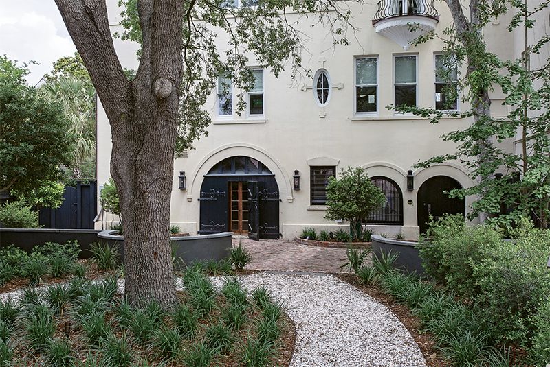 Go with the Flow: Maryland-based couple Rick and Kristy Schultz “bought a garage”—i.e. a three-story carriage house in sight of the Battery—as a second home, enlisting Richard Marks Restorations and Kristin Peake Interiors to transform the formerly drab dependency. Just as renovations were wrapping up, Tropical Storm Irma washed a foot and a half of surge into the ground floor (left), which spurred on storm adaptations. They revised the exterior hardscape with an eye toward drainage and changed up interior materials, furnishings, and electrical wiring to suit.