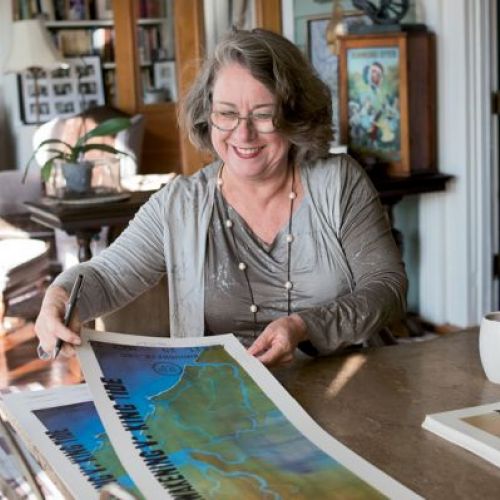 The hat is not just any hat. It’s a Jessica Murnane signature, handmade from a vintage mold by the famed hatmakers of Chicago’s Optimo. “The best hat shop in the world,” says Jessica, who counts working at Optimo as one of a “million different jobs I’ve had.” She’s also a wife; mother of three-year old Sid; and former graphic designer-turned-author, speaker, and podcaster who moved to Charleston from Chicago two years ago.