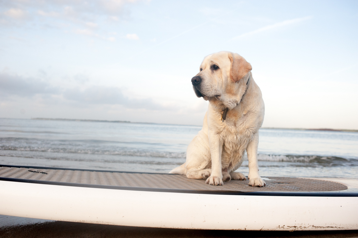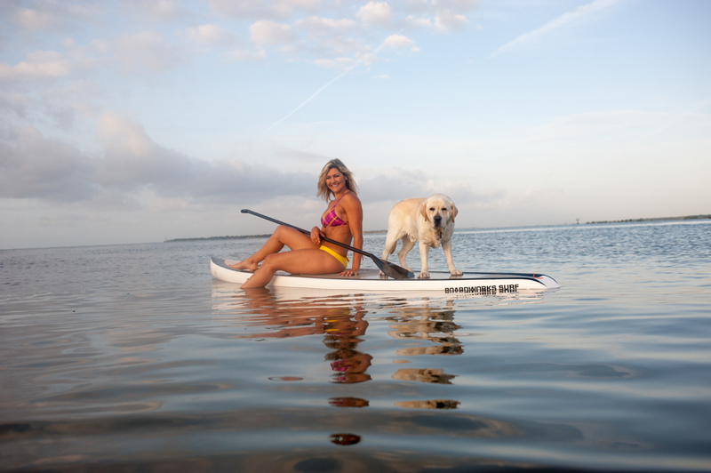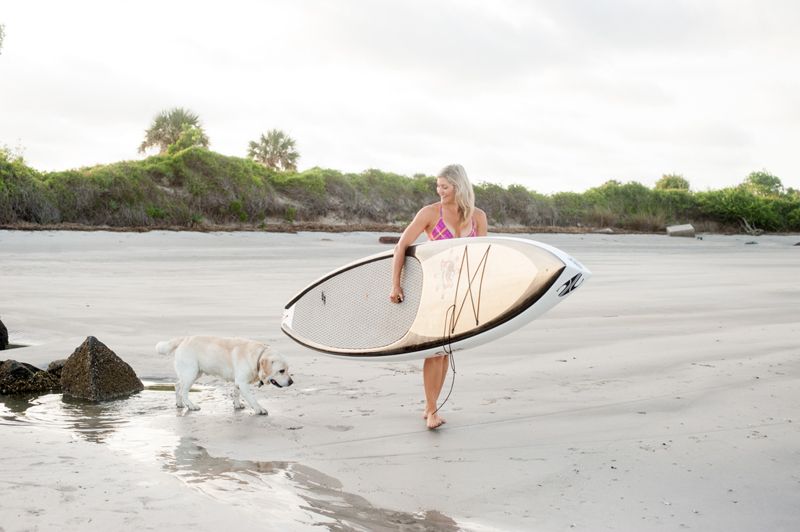 Local fitness trainer Stephanie Keenan gets lots of looks as she paddles Shem Creek, and that’s likely due both to her impressive physique and the pretty yellow English Lab calmly lying on the back of her paddleboard. “He’s always been super calm,” says Keenan of Cozmo, who she describes as both “Eeyore-like” and “a big, super-chill toasted marshmallow.”