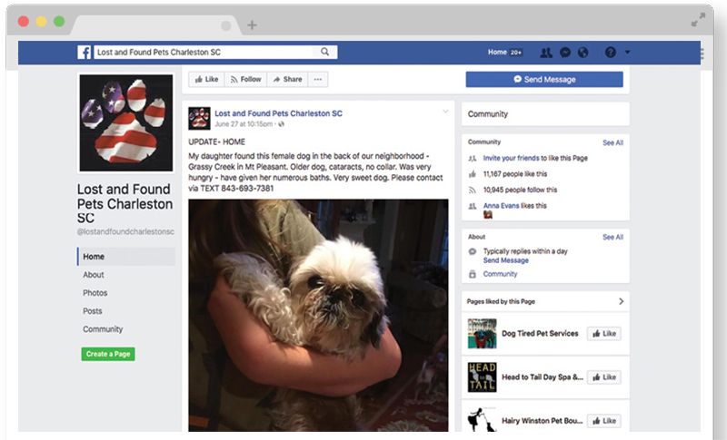 The largest, with more than 11,000 followers, is Lost and Found Pets Charleston SC. Numerous animals go up daily, with 100 or so people sharing each one’s info to their personal pages. And when a post is edited to broadcast happy news (“UPDATE—Gus’s people have been found! He’s home!”), the “likes” flood in.