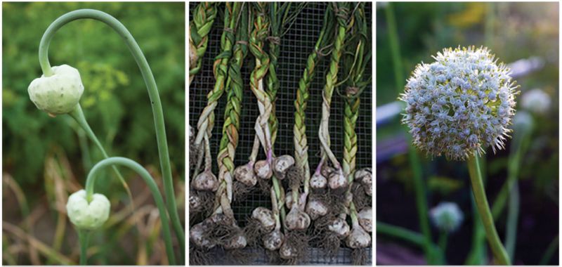 (Left to right) Hardneck garlic produces scapes that form attractive seed heads; braided softneck garlic cures on a screen; seed heads open into charming blooms.