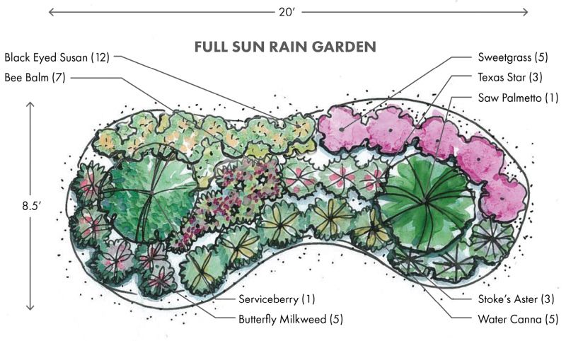 Clemson Extension’s “A Guide to Rain Gardens in South Carolina” publication includes sample designs like this full-sun option.