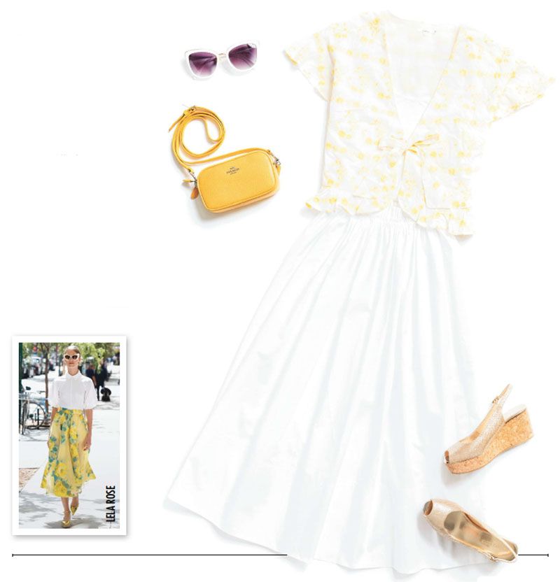 Yellow shines in many of this season’s collections, but Lela Rose’s ensemble combining the color with crisp white feels especially suited to the holy city. We kept the florals—and the flounce—but toned down the palette
