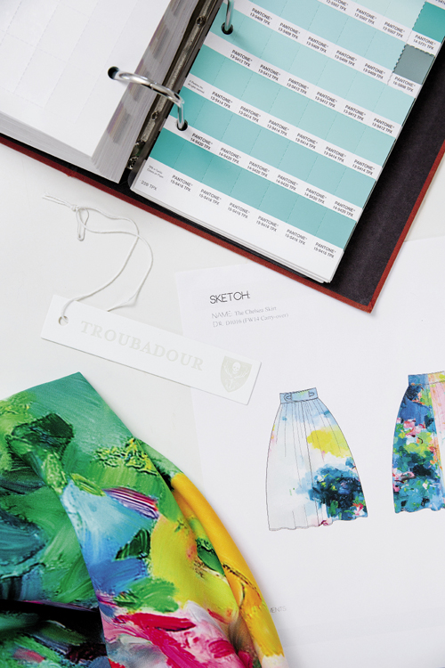 “As you can see, it’s not always glamorous,” says Carter, a North Carolina native and graduate of UNC Chapel Hill and New York’s Fashion Institute of Technology, who launched TROUBADOUR in Charleston five years ago after stints designing for J.Crew and Madewell. Since that 2009 CFW Emerging Designer show, Carter has been fine-tuning her line of bold prints-meet-Audrey-Hepburn-glam apparel, with sales growing each season. “I had this romanticized vision of what having my own label would be like, and here I am cutting thousands of pieces of string. You do what you have to do,” she adds.