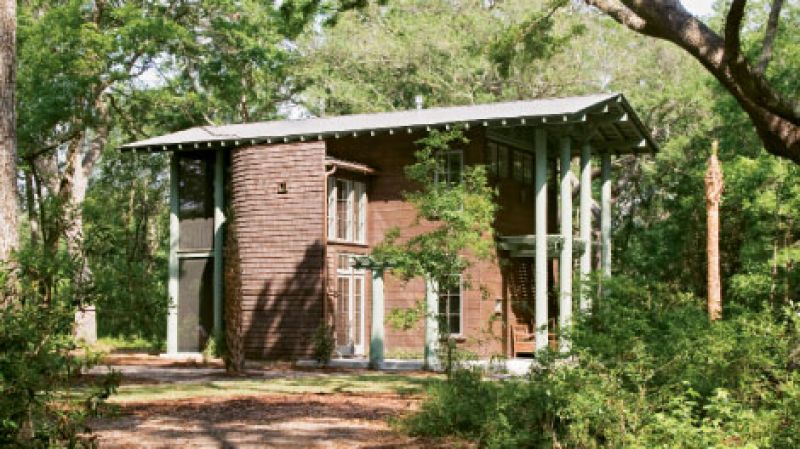 She’s right about that. The dwelling, a diminutive but hard-working 1,260 square feet, is a two-story, two-bedroom, three-porch oasis on just over a dense, acre-and-a-half mix of live oaks, palmettos, palms, and wax myrtles. A natural-stained cedar shingle and pine-planked exterior allows the gabled home to blend into the landscape, while inside, fresh white shiplap walls, towering ceilings, and pocket doors amplify the blend of private and public spaces. As Eleanor points out, the shift between the wild outdoors and tame interior—apparent only when you step over the threshold—is striking.