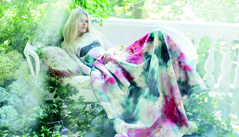 IN FULL BLOOM: Honor print bustier gown, $3,400 at honornyc.com; Akris Punto mesh sleeve button up, $395 at Rapport; silver tea cups and spoons courtesy of Polished! and silver pitcher courtesy of OOH! Events