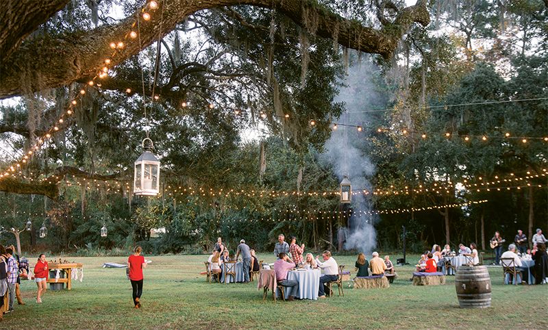 For outdoor parties, the goal is to let the Lowcountry landscape shine, says Melissa, who suggests you survey the land to find the most striking natural element and design from there. A pair of towering oaks is the visual focal point of her parents’ backyard, so the buffet table, bars, and oyster table were situated at their base. Bistro lights and lanterns provided an ambient glow over the lawn when the sun set (a 2 p.m. start time allowed for hours of natural light); hay bales offered right-at-home (not to mention cost-effective) additional seating; and rented wooden elements such as tables, chairs, barrels, and a beer trough fit with the natural aesthetic.