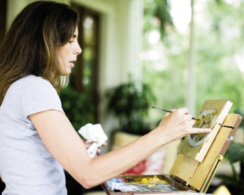 “I was the kid that drew on the walls, even in the closet,” she says, so it’s natural that after college and a few years in the corporate world, she returned to that passion and started painting, too. In 1996, she moved to the Lowcountry and began working with nonprofits, painting murals and furniture on the side. More and more, she painted on boards and linen as well, gaining representation by Horton Hayes Fine Art seven years ago. Today, her work hangs in corporate collections (such as those of Balsam Mountain Preserve and Roper St. Francis Healthcare), as well as in private ones throughout the U.S. and overseas.