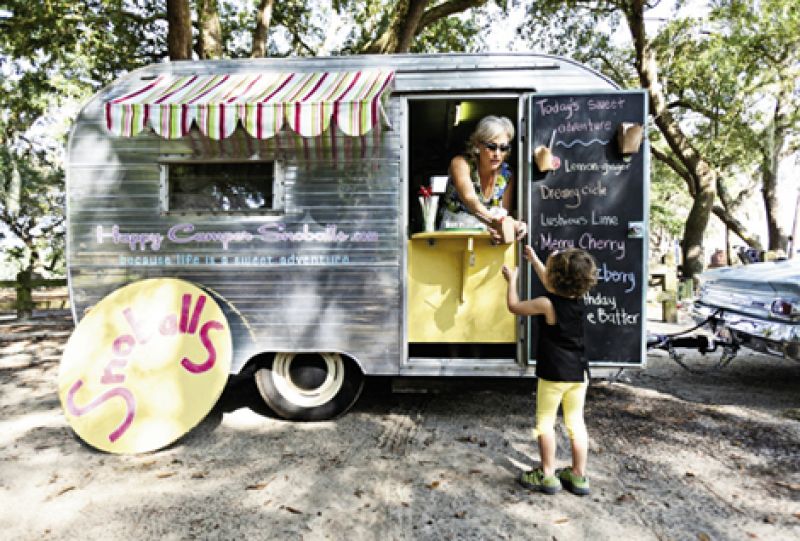 When New Orleans native Rena Lasch moved to Charleston in 2006 following Hurricane Katrina, she was not a happy camper. “I was dazed and needed to reinvent my life,” she recalls. She was looking for an escape from reality—a diversion where life could be a little bit more colorful, a little bit sweeter. Her idea? Start a business. Her one requirement? It must be mobile. “In case I had to move again,” she says. As for the product, that was easy. Longing for the simple pleasures of home, Lasch couldn’t stop craving traditional New Orleans Snoballs, a variation on the Snocone, but made with smoother ice. She was busy perfecting her recipes for the icy treat, using homemade simple syrup and fresh fruit, when a vintage 1965 mini Canned Ham camper came up for sale on Craigslist. “It was perfect,” she says. And Fourth of July of 2010, Happy Camper Snoballs debuted. “Life is theater,” says the sno dealer, who arrives at each event and food truck rodeo in a kitsch costume complete with retro sunglasses and apron. “When I moved here, I decided whatever I chose to do, I wanted to be around happy people every day,” she says. It sounds like no easy feat, but then again, have you tried frowning with a Snoball in hand?