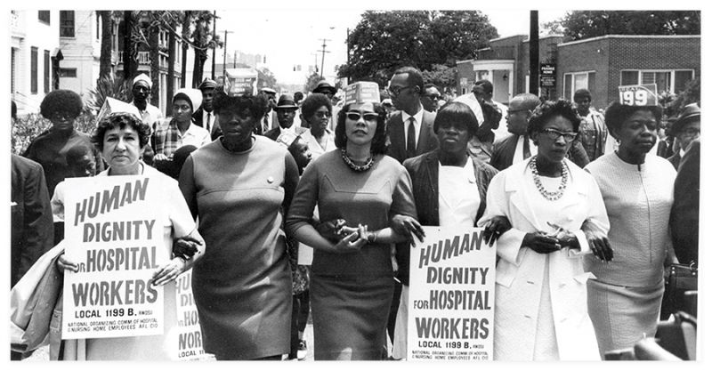 Fueled by racial inequity in wages and staff treatment, hundreds of mostly African American and female hospital workers at the Medical College (now the Medical University of South Carolina) began a strike in March 1969, with employees of the Charleston County Hospital following suit shortly afterward. Assisted by civil rights leaders Ralph Abernathy and Coretta Scott King (third from left), as well as local advocates such as Bill Saunders and Rosetta Simmons, strike organizers advocated for nonviolent activism, responding to curfews and the presence of the National Guard by holding nighttime demonstrations. After 100 days of protest and threats from longshoremen to strike in solidarity, the Medical College relented, rehiring all strikers, establishing grievance protocols, and ensuring equity in pay; three weeks later, the Charleston County Hospital did the same.