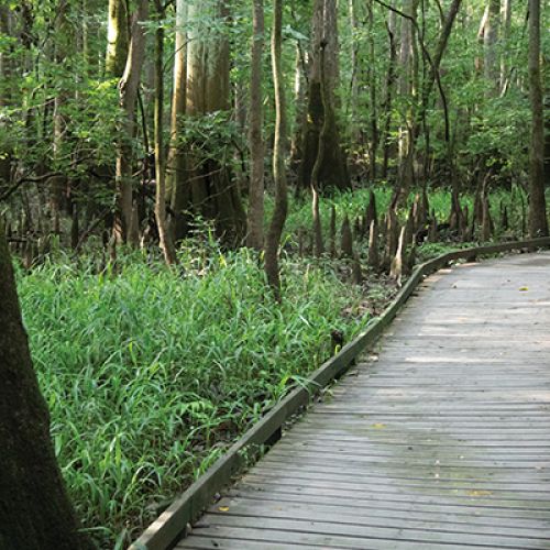 A lush oasis of verdant wildness right off busy King Street, this gem of an alleyway is a secret garden of sensual delight blooming alongside centuries-old gravestones. Connecting King and Archdale streets, this enchanting walkway winds through the churchyard of the oldest Unitarian Church (circa 1772) in the South, and the second oldest sanctuary in Charleston. This section of the longer Gateway Walk, designed by landscape architect Loutrel Briggs and the Garden Club of Charleston in 1930, extends from Archdale Street through the Gibbes Museum courtyard and down to Philadelphia Alley. The entrance off King Street is bordered with ferns and shade plantings traditionally found in a Charleston garden; approaching the churchyard, native flora grows and blossoms willy-nilly—its less manicured state reflecting the church’s beliefs about the web of life. When a portion of the wall on Archdale Street was removed to provide wheelchair access, the original bricks were repurposed for a memorial honoring the enslaved brickmakers who helped construct the church, featuring an African Sankofi symbol of a bird looking backward, meaning, “learning from the past in order to move forward.”