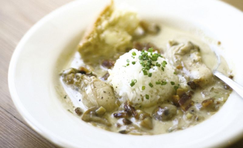 Stehling picked up the recipe while working at Chapel Hill’s Crook’s Corner before opening Hominy in 1996. The James Beard Award-winning chef says that with a cook time of only 15 minutes, it makes for an easy holiday dish. To dazzle your own kith and kin, start by cooking five slices of bacon for garnish. “Then turn up the heat and toss in your onions,” explains Stehling. “Their caramelization gives the stew its color and flavor.” Add garlic to the pan, but don’t let it brown, he warns, as that can throw off the flavor profile. “You’ll know the oysters are poached when the sides curl up,” the chef notes. When you’re ready to eat, scoop a hearty serving of Carolina Gold rice into the center of each bowl. Garnish with chives and bacon, and Santa might give up cookies for just a spoonful.