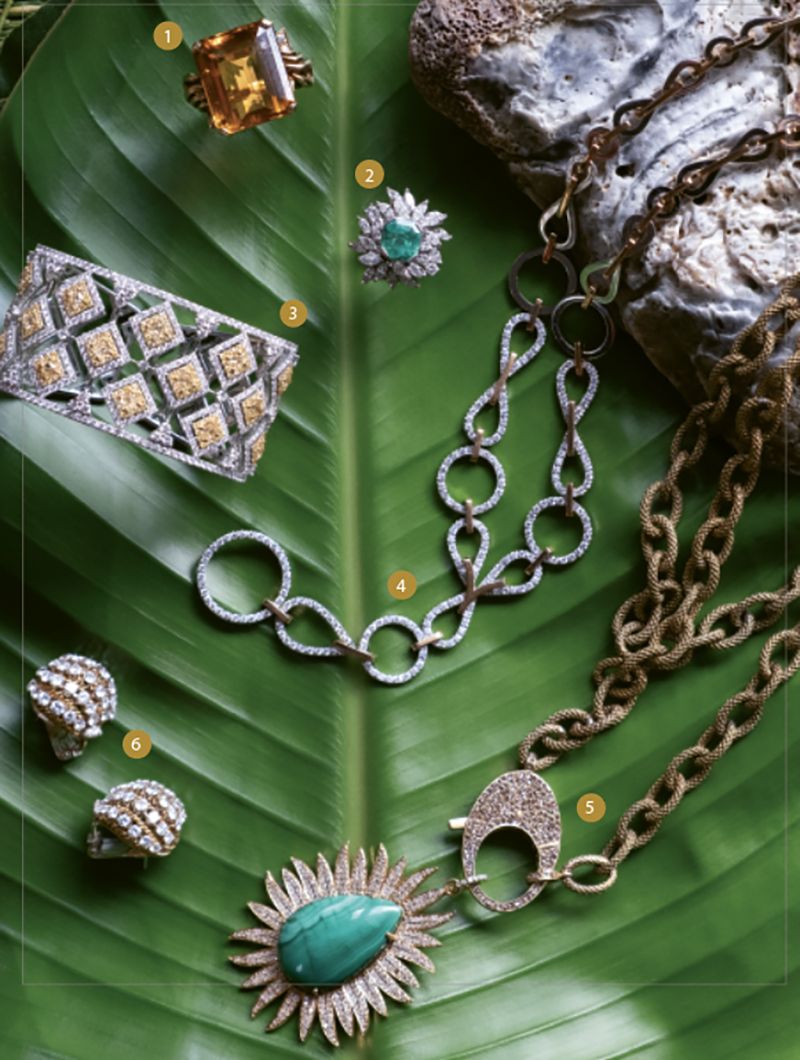 Statement-making jewelry goes high-end with chunky gold links, sparkling gems, and earthy motifs
