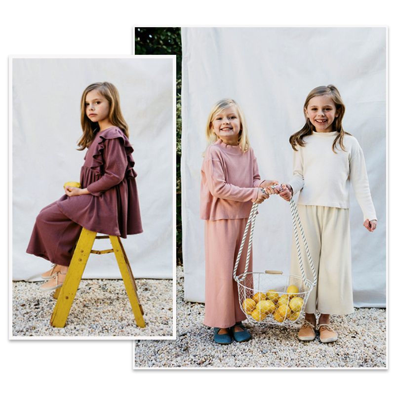 Library Littles’ “Friday” dress ($75), “Monday” mock neck-tops ($48), and “Tuesday” pants ($58)