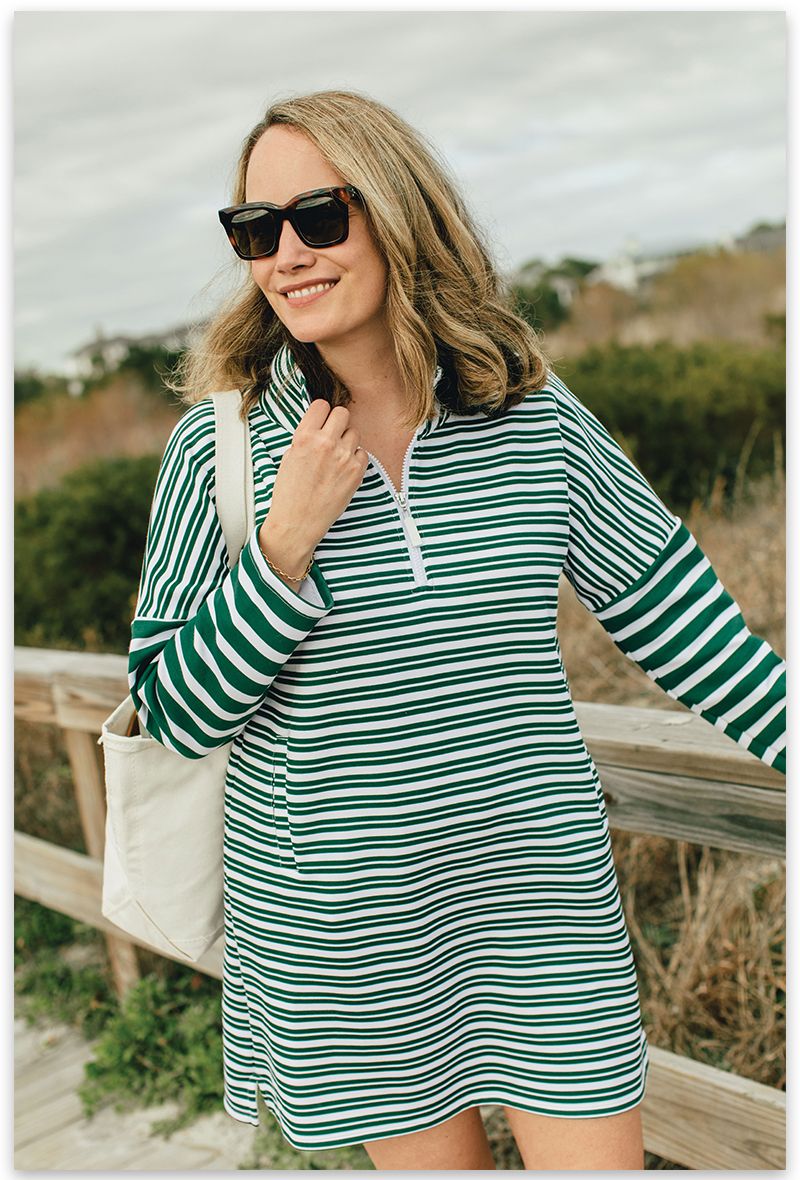 Local lifestyle blogger Grace Atwood, founder of The Stripe, has recently introduced a capsule collection with Philadelphia-based activewear brand Addison Bay. The collaboration features 13 pieces, including a striped “Grace” dress, a sleeveless ”Sullivan” dress, and ”Tradd” coordinating pants set, as well as Addison Bay’s signature crew neck and leggings—all in a coastal-inspired palette of green, orange, and navy. “It started with a love of their ‘Everyday Crewneck,‘ a sharply tailored pullover with gold zippers,” shares Atwood. “From there, I fell in love with the rest of the line pretty much immediately. Our collection is perfect for the woman on the go, whether she is jumping on an airplane or running around the playground.” Shoppers can find the polished essentials on the brand’s website. [addisonbay.com; thestripe.com]