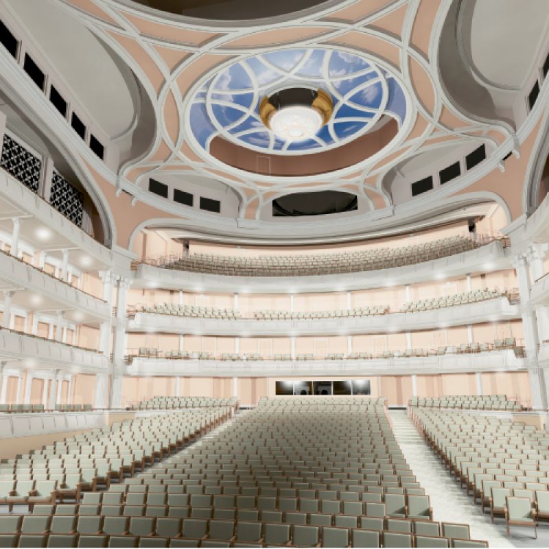 Music, dance, and drama patrons have been gazing up at ceiling murals depicting sky scenes since performing arts venues were born in their modern form, explains Craig Williams, principal with David M. Schwarz Architects, the lead design architect on the new Gaillard Center. Andrea Palladio’s 1580 Teatro Olimpico likely inaugurated the tradition, with buildings following suit around the globe.