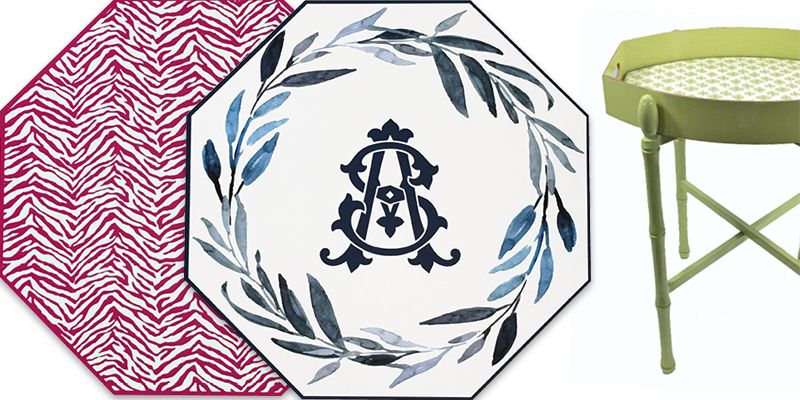 Left: New two-sided octagonal place mats ($38 each) can be monogrammed. Right: The “Stinson” tray ($106) and stand ($96)