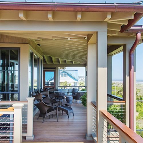 While overseas, the owner of the neighboring Kiawah lot made an offer to buy them out, and they sold. After returning to the States, they realized they still wanted to build on the island and found a new, deep lot with magnificent marsh views and nice proximity to golfing, shopping, and a kayaking dock. “It actually suited us better,” says the wife. In 2008, they purchased the property and began imaging their plan B, fronting the marsh, with pristine views back toward Charleston, says the husband—“Our final destination.”