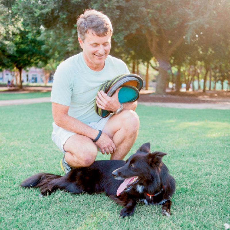 Now nearly two years old, the 32-pound Nima has aptly filled her predecessor’s collar. Each morning, she joins Thomas on a jog before he heads to his office at Dixon Hughes Goodman. His mother, Anne, walks Nima in the afternoon before he arrives home from work for their daily stroll down King Street to Marion Square, where they often spend an hour training and catching discs.