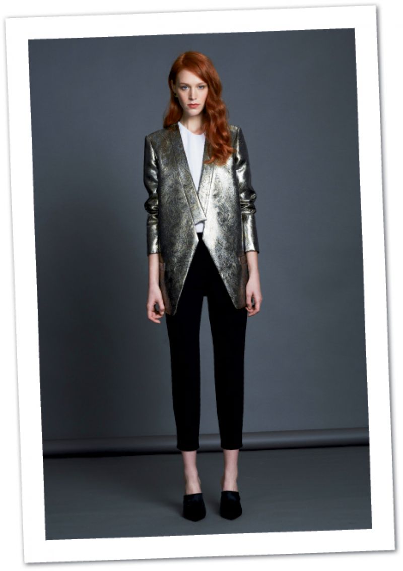 “Metallic Tuxedo-Stripe Blazer” by Smythe, with black stripes up sides and inner sleeves